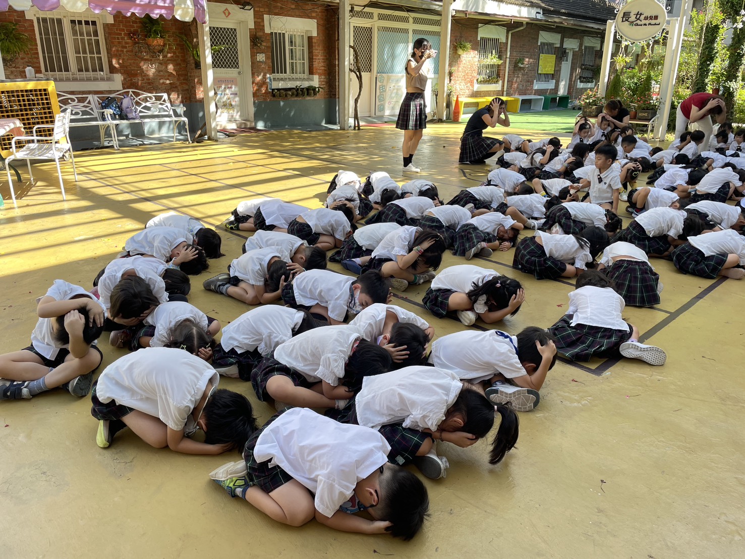921國家防災日,幼兒們將於9/19實地進行防災演練。聽到警報聲時,立即採「趴下、掩護、穩住」,躲在桌下、手抓穩桌腳。聽到廣播「地震稍歇」後,保護頭部、穿上拖鞋、遵守「不推不跑不語」安全原則,跟著老師往疏散避難路線逃生,至安全疏散地點集合。